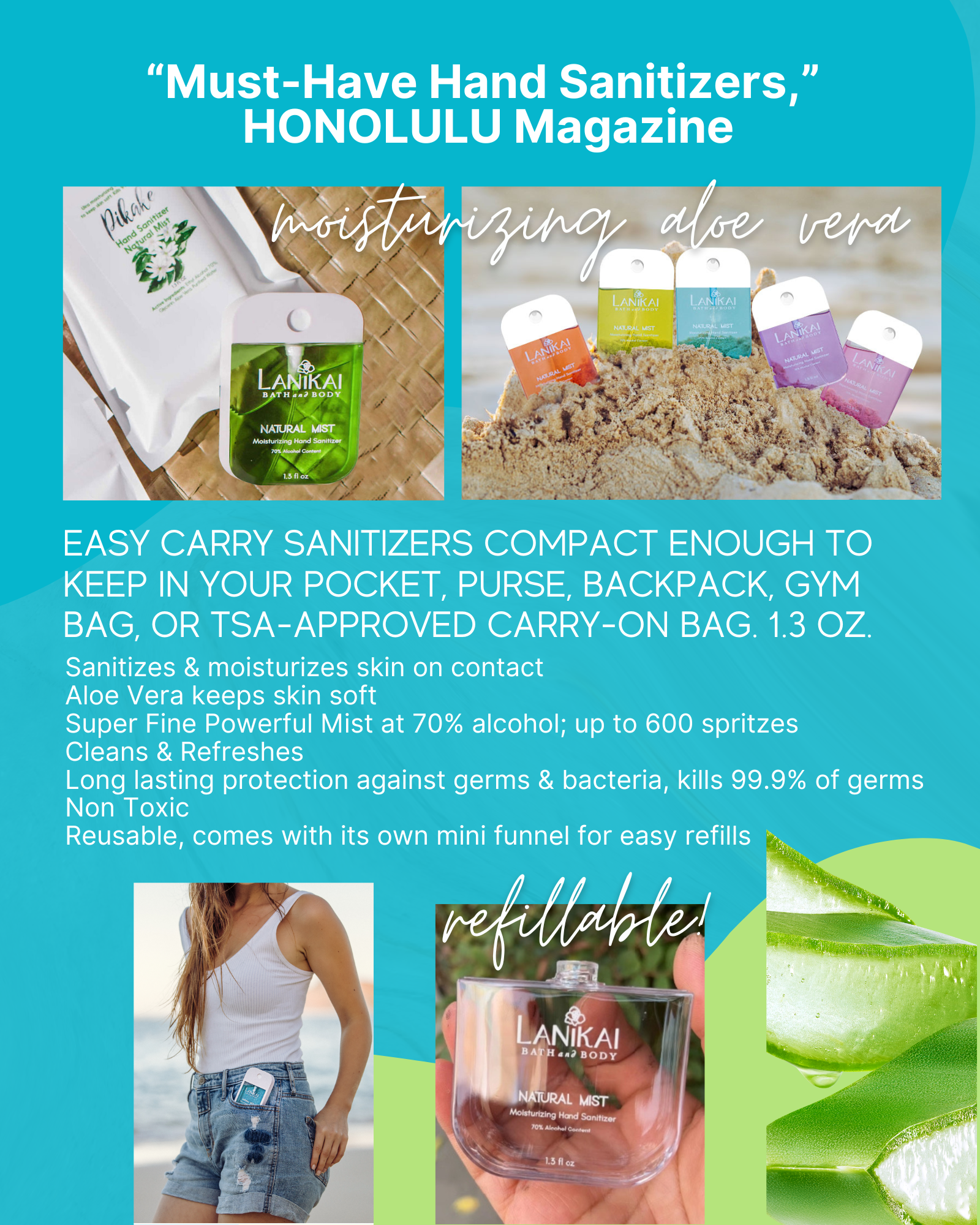 Stay safe and refreshed with Lanikai Natural Pocket Sanitizers, the ultimate blend of protection and care. Recognized as the "#1 Must-Have Hand Sanitizer" by Honolulu Magazine, this compact sanitizer is ideal for pockets, purses, backpacks, or TSA-approved carry-ons. Enriched with moisturizing aloe vera, it prevents dryness while offering a fresh, natural fragrance. Crafted with organic ethanol and free from harmful chemicals, it’s gentle on skin and effective against germs.